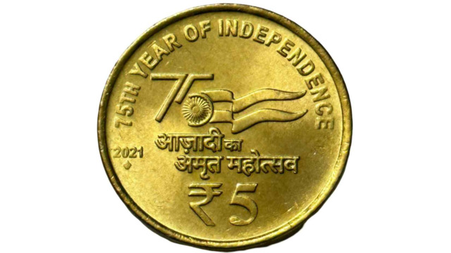 - Design: At the center logo of 75 with flag and above at periphery “75 YEAR OF INDEPENDENCE” inscribed, below logo “आज़ादी का अमृत महोत्सव” and “₹1” inscribed. Year and mint mark is left to “Azadi Ka Amrit Mahotsav” which is inscribed in Hindi.