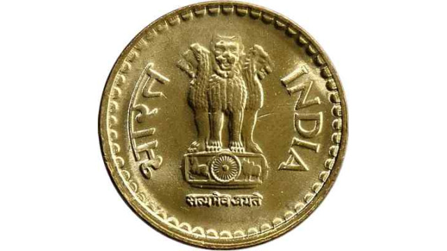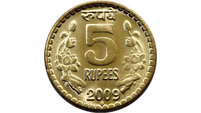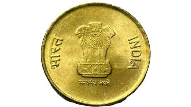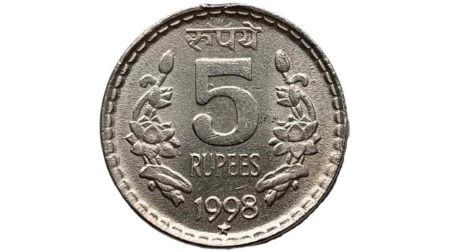 - Design: Rupees inscribed in Hindi at the top and in English below of value “5” at the center. Date below that then mint under that. Both sides of Denomination is has Lotus flower vine.