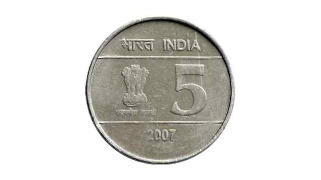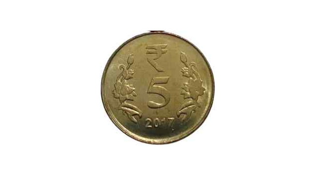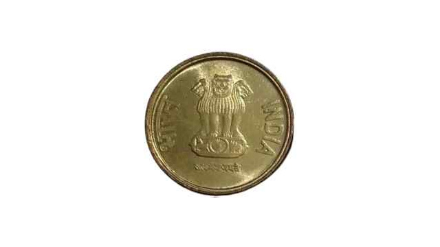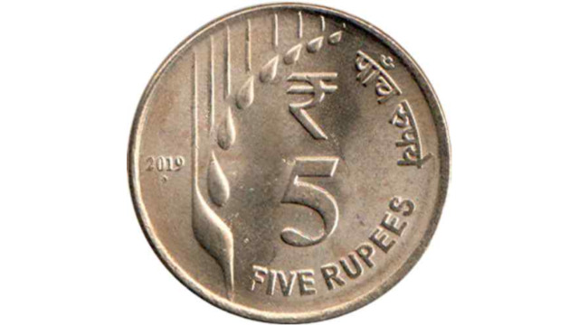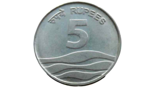 - Design: The Rupee “₹” symbol is shown above the denominational value “5”. The design of rain drops/waterfall is flanked on the left periphery of the coin. The date to the left side of it, the denomination in words in Hindi and English to the right of denomination.