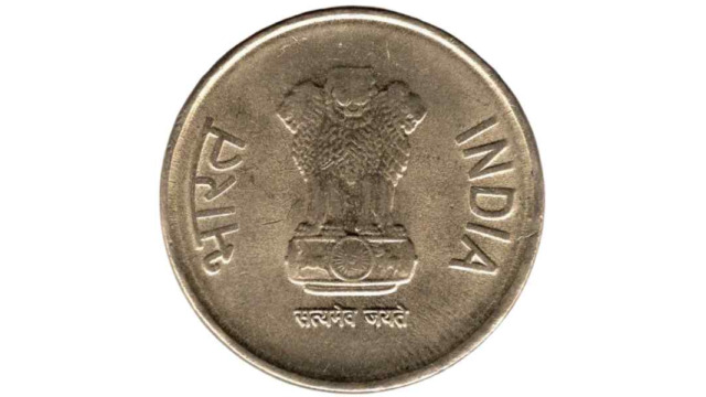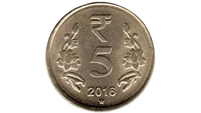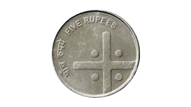 - Design: Denomination “Five Rupees” inscribed in Hindi and English language. A cross with 4 dots at each quarter.